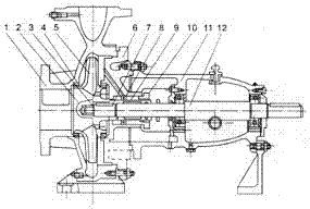 | 1 | 泵體 | 7 | 軸鍵 | 2 | 葉輪螺母 | 8 | 填料環(huán) | 3 | 制動(dòng)墊母 | 9 | 填料 | 4 | 密封 | 10 | 填料壓蓋 | 5 | 葉輪 | 11 | 懸架軸承部件 | 6 | 泵蓋 | 12 | 軸 |